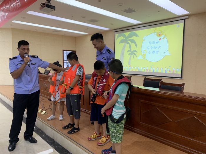 在室内现场,街道邀请了葛洲坝实验小学的游泳冠军队教练胡晓勇老师前来为学生们教授游泳的基本知识。葛洲坝船闸派出所民警在会场与学生们开展互动,开展了穿救生衣比赛、知识抢答等活动。